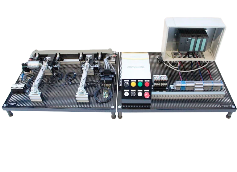 - Ohjattava mekaniikka on asennettu omalle asennuslevylle, jossa on 0-30 V DC-moottori alennusvaihteella. Tunnistelijoina käytetään neljää lähestymiskytkintä. Lisäksi mekaniikkaan kuluu kaksi pneumatiikka-sylinteriä neljällä magneettitunnistimella.
