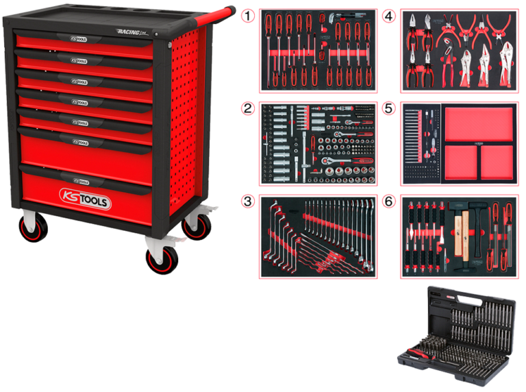 KS Tools Racing line 7 vetolaatikon työkaluvaunu 598 osaisella työkalusarjalla