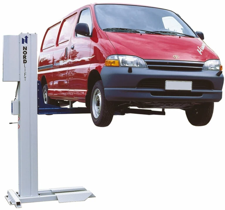 - Kotimainen Nordlift DH-2500 1-pilarinostin on varmatoiminen ratkaisu korjaamoon.